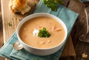 Next, add the fish or vegetable stock to the pot and bring to a simmer. Allow the flavors to meld together for about 20 minutes. Then, using a blender or an immersion blender, puree the mixture until smooth. Return the soup to the pot and add the heavy cream. Stir well and season with salt and pepper to taste.